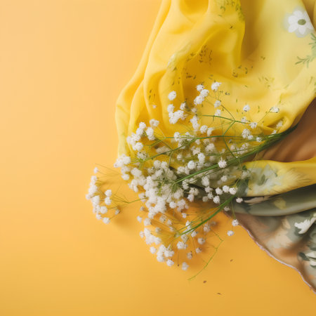 Yellow silk fabric with gypsophila flowers on yellow background.