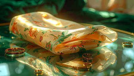 A vibrant silk fabric in yellow and blue tones is elegantly draped on a polished surface, reflecting a serene and stylish modern interior atmosphere perfect for decor and design inspiration.