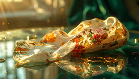 Close-up of a beautifully tied silk scarf showcasing intricate patterns and vibrant colors, perfect for enhancing any fashion outfit or accessory collection.