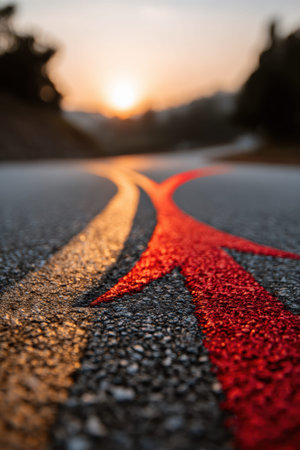 A winding road features distinct markings guiding toward success as the sunset creates a warm glow on the horizon.