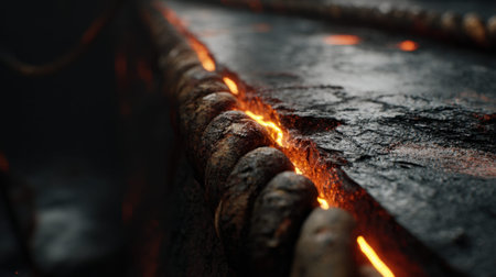 Dynamic fire streaks illuminate volcanic rock surface in low light setting