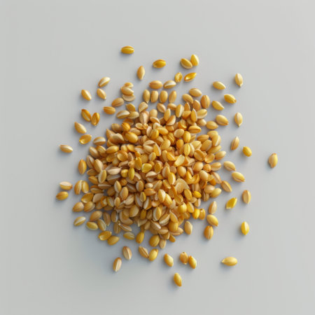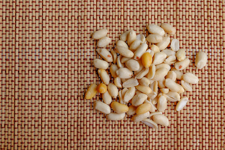 A delightful arrangement of pine nuts scattered across a vivid yellow backdrop, highlighting their unique shapes and earthy tones. These nuts evoke a sense of warmth and nature.