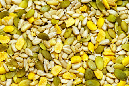 Top view of toasted mix of seeds - sunflower, lin and sesame seeds. Small amount- many proteins for healthy eating