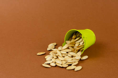 Small bucket and pumpkin seeds on a brown background. Inverted green verdot and toasted pumpkin seeds scattered around. Ready-to-eat snacks. Close-up, selective focus.