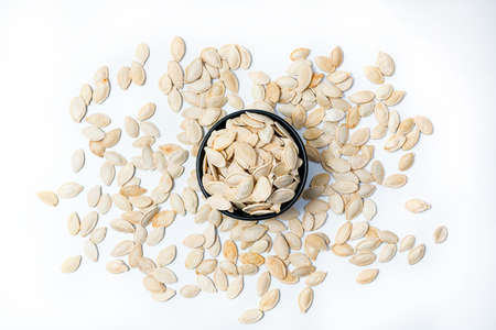 Pumpkin seeds in a bowl isolated on white background with some seeds spilled around. Roasted and salted pumpkin seeds for snacks