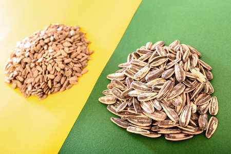 Three round piles of black roasted sunflower seeds, peeled sunflower seeds and husk on yellow, green and red paper background.