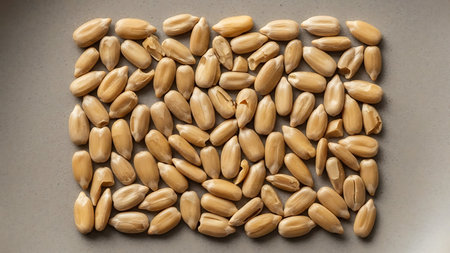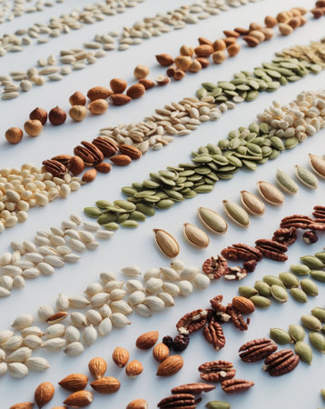 AI Generated. Assorted seeds and nuts arranged in colorful rows