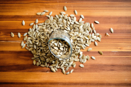 Sunflower seeds are scattered across a rustic wooden surface, with a glass jar tipped over next to vibrant yellow flowers in a softly lit environment.