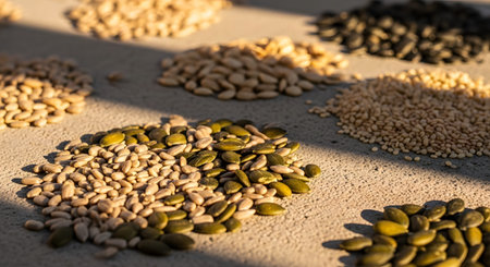 Distinct piles of various seeds and nuts, including sunflower and pumpkin seeds, are arranged on a textured concrete surface. The hard lighting casts long shadows, emphasizing the texture and variety of these healthy food ingredients.