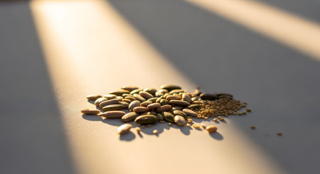 A small pile of mixed seeds, including pumpkin and sunflower seeds, rests on a smooth surface illuminated by a beam of sunlight that creates dramatic shadows. The image highlights healthy snacking and organic ingredients.
