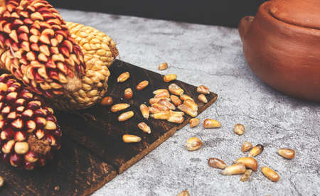 Tray with roasted corn in Peru to accompany traditional Peruvian dishes such as ceviche or rice with seafood.