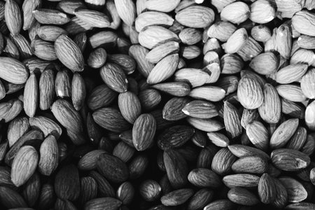 Almonds scattered on a black table. Almond is a healthy vegetarian protein nutritious food. Natural nuts snacks.