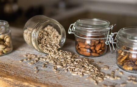 Sunflower seeds scattered on the white vintage table from a jar with other nuts on background. Healthy vegetarian protein nutritious food. Sunflower seed on rustic old wood.
