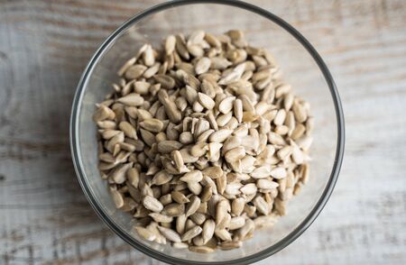 Sunflower seeds in a small plate on the wooden vintage table. Healthy vegetarian protein nutritious food. Sunflower seed on rustic old wood.