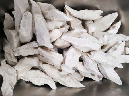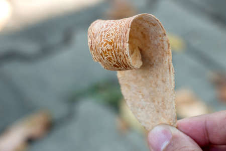 Delicious sliced sheets of dried and crispy pork in transparent plastic bag. Thai style appetizer