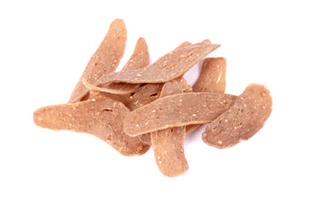 A pile of dry wheat light thin slices of dry diet bread on a white background isolated