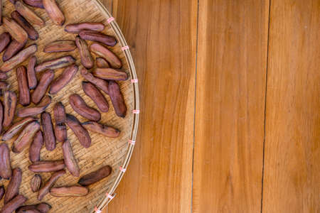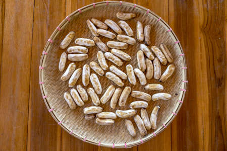 Pansib pastry stuffed in wooden cup, Thai style dumplings stuffed, thai dessert, kind of snack. Top view.