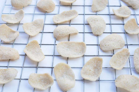 Prawn crackers on blue background. Shrimp crispy rice snack