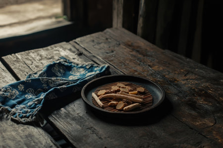 Ginseng roots on a black plate, ginger snaps in a small wooden tray with a blue and white cloth next to it on a bamboo mat on a rustic table, close-up view, photo-realistic, cinematic lighting, professional photography, studio portrait. --ar 3:2 --v 6.1 Job ID: 71d47978-f0fd-46be-bb16-2fe8df9f34ab