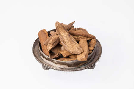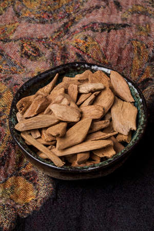 Close up of babool ayurvedic herb in a clay bowl on a gunny bag's surface for the treatment of various tooth-related diseases. Horizontal shot.