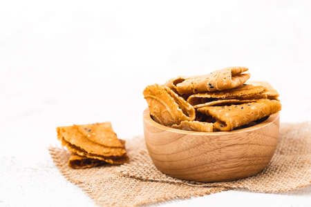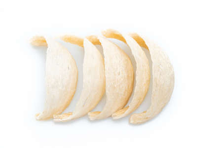 Delicious crispy coconut folded on white background for Thai dessert, asian food and eating concept