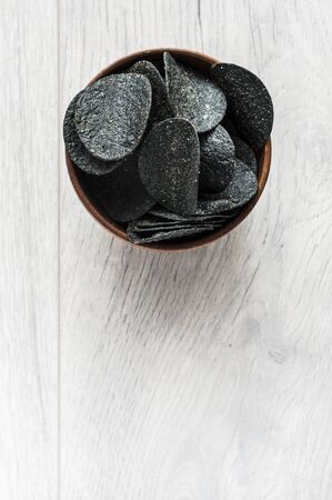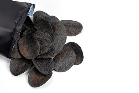 Black potato chips on yellow background. Black chips with salt, activated charcoal and red pepper.