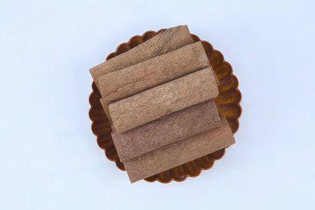Cinnamon sticks in a wooden bowl on a white background, top view