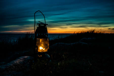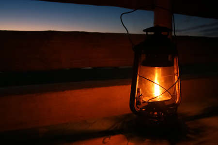 Old classic oil lantern burning with an orange flame by the ocean at dusk. . High quality photo