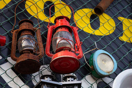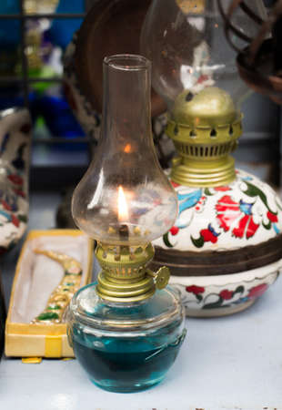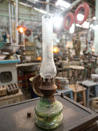 An old, vintage lamp with a shade in an antique store. Antiquarian shop with old ancient lamps. Antique street shop in Bali.