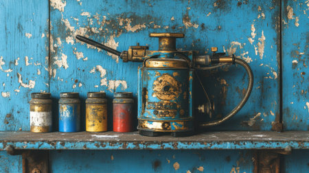 A vintage oil sprayer and colorful cans are displayed on a rustic wooden shelf against a peeling blue backdrop, showcasing a blend of history and craftsmanship.