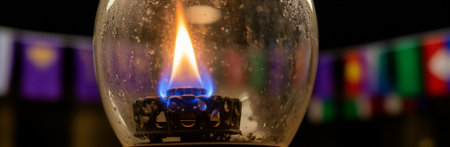 Close-up of vintage oil lantern flame with colorful background flags. That the image is generated using AI.