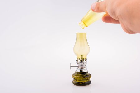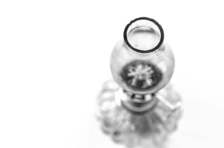 Small oil lantern on white background, Camping light and interior decoration, vintage brass case.