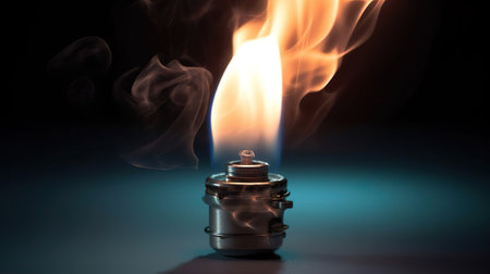 An oil lamp burns brightly, casting warm light in a dim environment. The flames dance and flicker, creating an inviting atmosphere perfect for relaxation or gathering.
