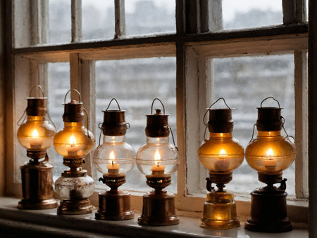 A charming oil lamp shines with a vibrant flame, creating a warm atmosphere in a cozy indoor setting. The glow adds a touch of elegance to the surrounding decor.