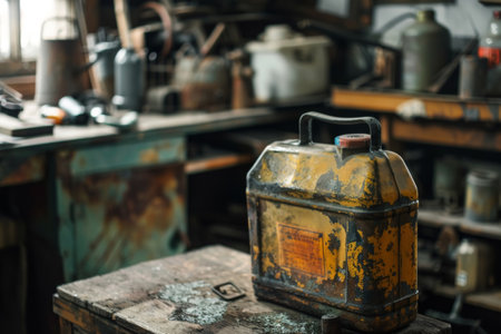 Old, rusted gasoline canister in a workshop. Vintage object and industrial concept.
