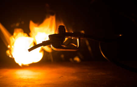 Creative concept. Silhouette of gasoline pistol miniature on dark toned foggy background. Fuel gun close up burning. Selective focus