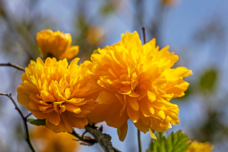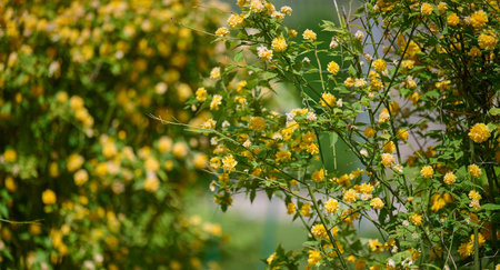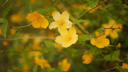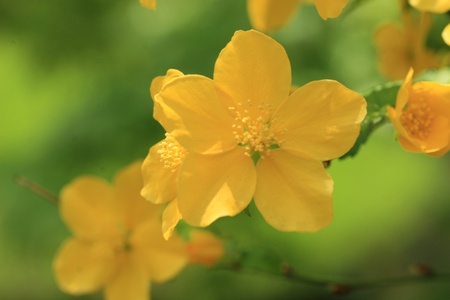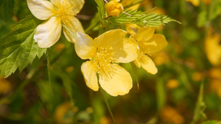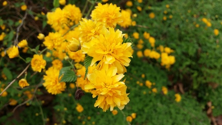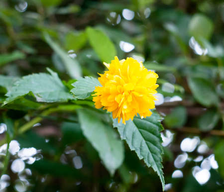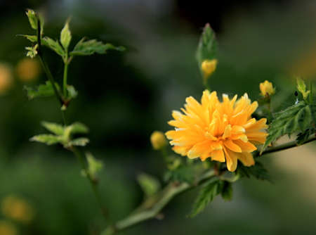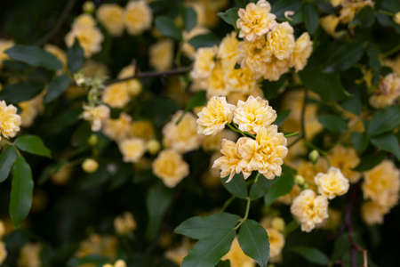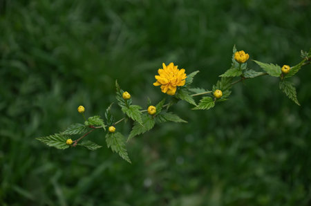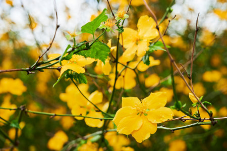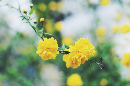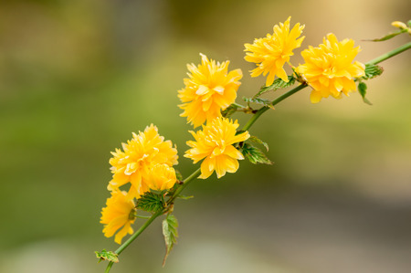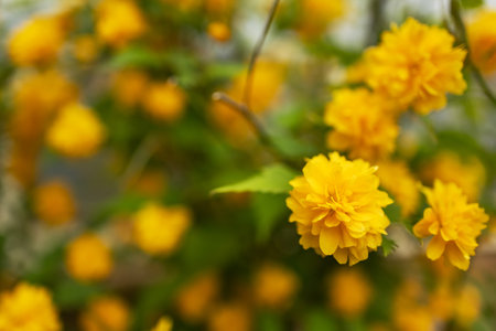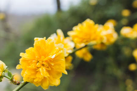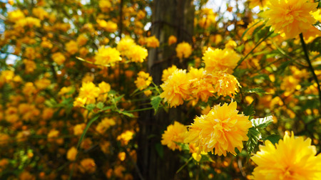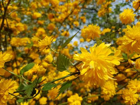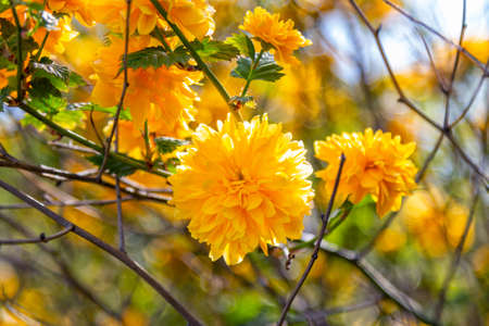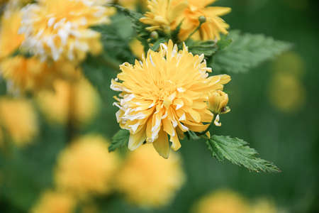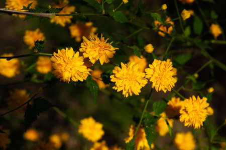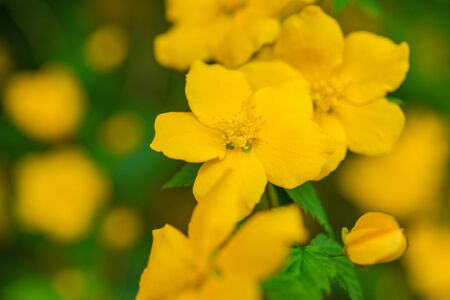 Japanese rose, Kerria japonica blossoms in a spring garden. Yellow and green colors natural background.