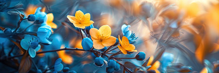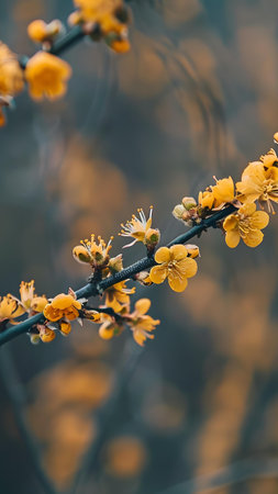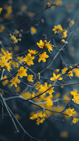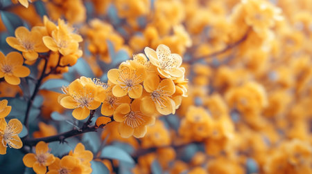 A vibrant display of bright yellow flowers enveloped in a soft focus background, creating a serene and captivating atmosphere perfect for springtime themes.