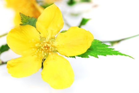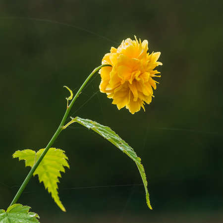 Kerria japonica, a beautiful yellow flowering shrub. Here seen as a single branch in full bloom. This is the cultivar Pleniflora.
