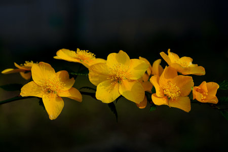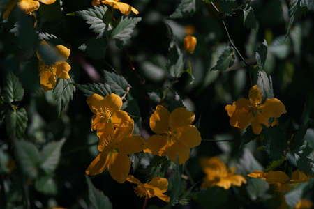 The closeup view of bright yellow flowers of the Japanese rose (Jpanese kerria) in orchard of Kyiv Botanical Garden, Ukraine