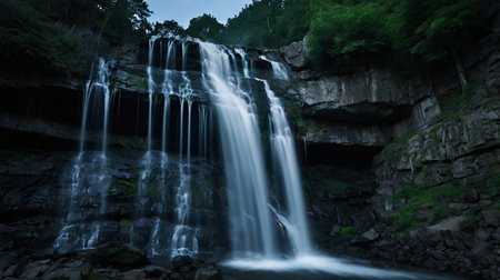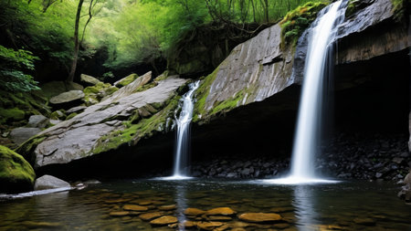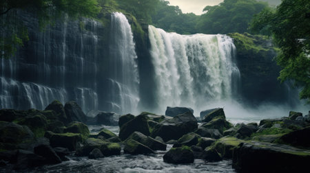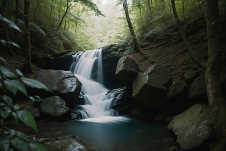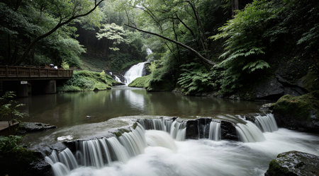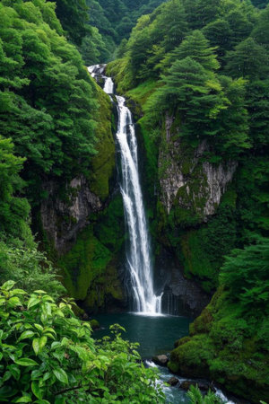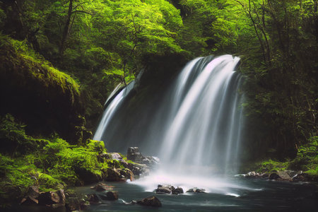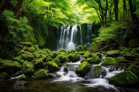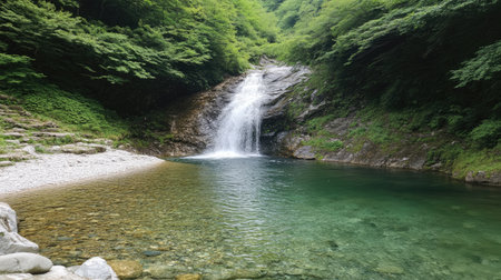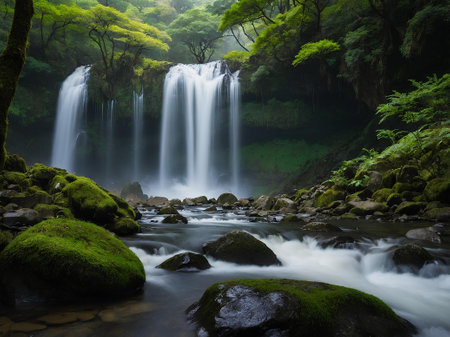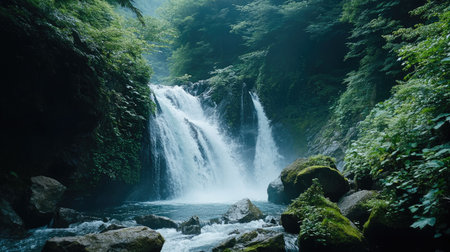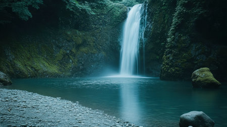 waterfall in the forest at nihon yamanashi national park, capturing the essence of jessica rossier's style. this serene and moody scene resembles the rural landscapes of china, particularly the tranquil and captivating terrain of northern china. the image showcases a harmonious blend of dark gray tones and light aquamarine hues, reminiscent of joong keun lee's outdoor scenes. ai generated