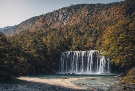 A serene autumn forest features a tall waterfall cascading over dark rocks, surrounded by colorful leaves and lush greenery. The tranquil scene evokes calm, nature, and natural beauty.