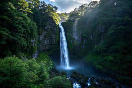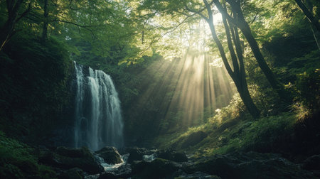 Rays of sunlight filter through the trees in Kikuchi Valley, Japan, illuminating a cascading waterfall and the surrounding green forest in a serene, peaceful setting.