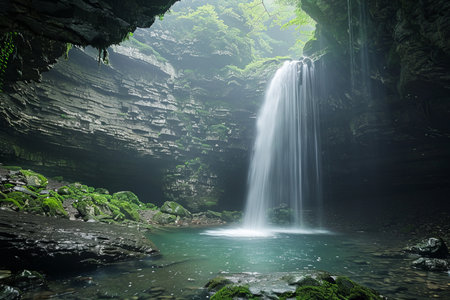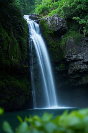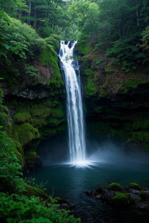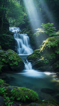A serene waterfall cascades down moss-covered rocks, surrounded by lush greenery and mist. This tranquil scene invites peace and connection with nature.