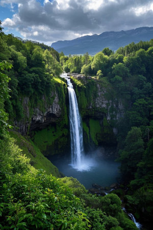 A picturesque waterfall flows into a clear mountain pool, surrounded by lush greenery. This serene landscape offers a peaceful retreat for nature lovers and adventurers alike.