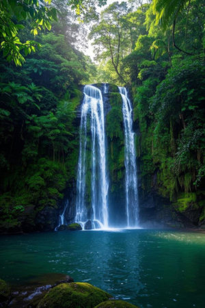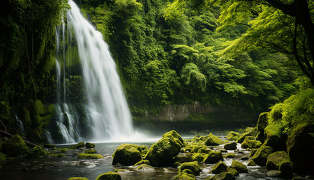 A mesmerizing waterfall plunges through a vibrant green forest. Moss covers rocks in the crystal stream below.