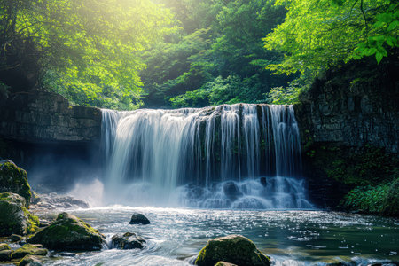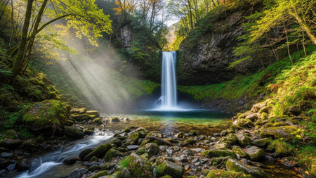 A cascading waterfall plunges into a clear pool, surrounded by vibrant green foliage and moss-covered rocks. Sunbeams pierce through the trees, illuminating the water and creating a dynamic composition. The scene suggests a tranquil, natural environment, suitable for various commercial and editorial applications.
