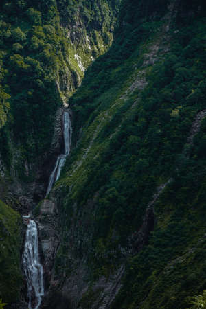 Waterfalls deep in the green forest, clear springs pouring down from the mountain stream