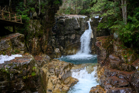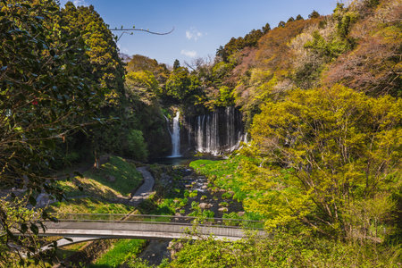 Serene Shiramizu Falls in Japan cascades down a lush cliffside, framed by vibrant spring foliage. A tranquil footbridge and walking path enhance the picturesque landscape. Breathtaking natural beauty.