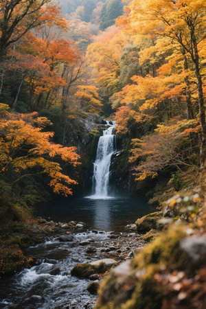 A tranquil waterfall flows down a mossy rock face through autumn foliage in a dense forest. Perfect for nature, travel, and outdoor lifestyle imagery with serene vibes.